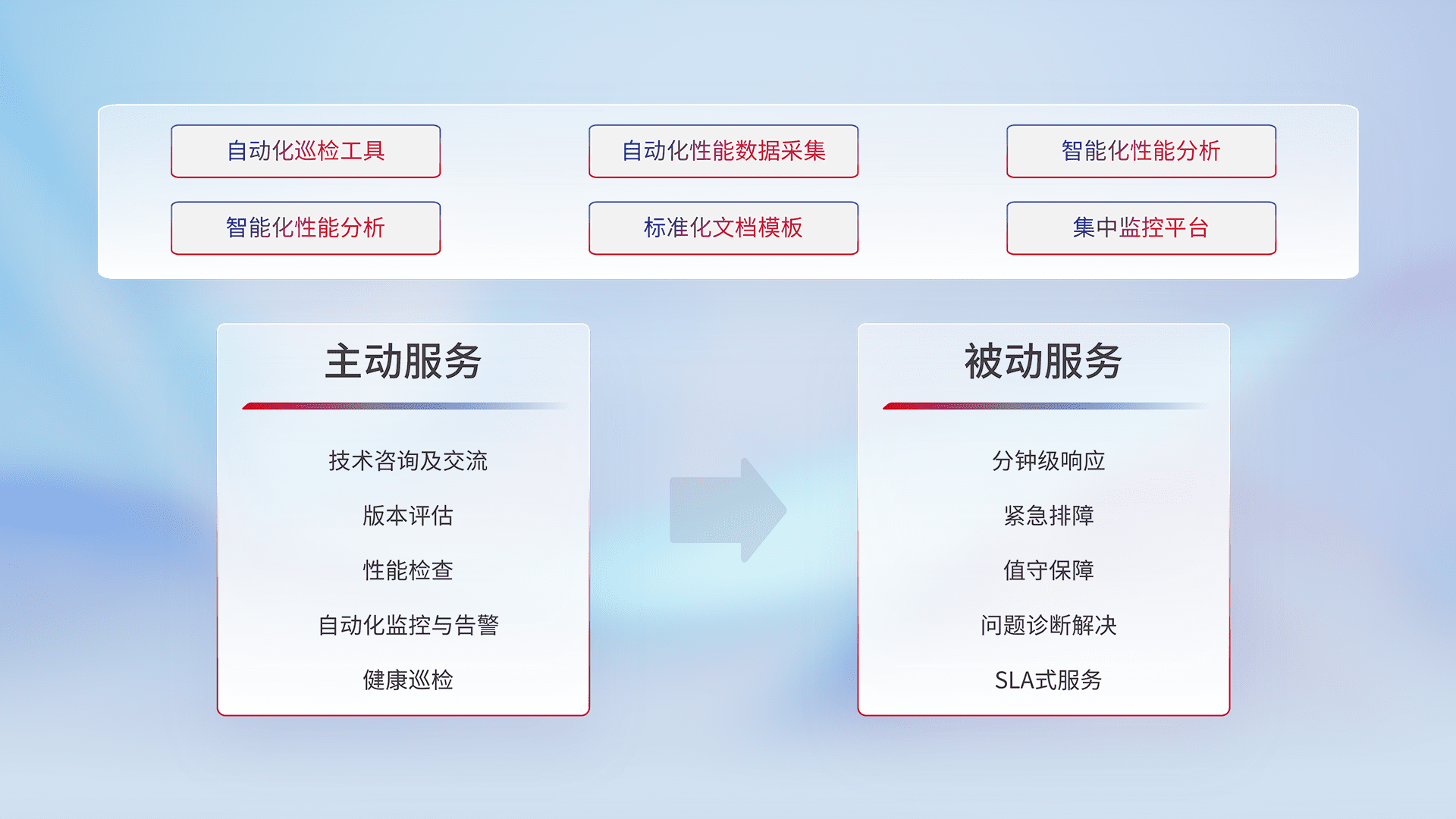 智能化工具和标准化文档,,,保障服务质量,,,,提供主动服务(包含技术咨询、、、、版本评估、、、、性能检查、、自动化监控与告警、、、健康巡检)和被动服务包含(分钟级响应、、、紧急排障、、、值守保障、、问题诊断解决、、SLA服务)。。。。